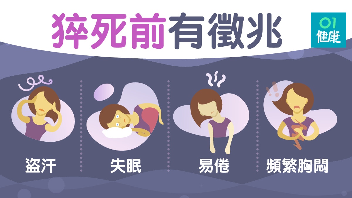 4. 其他:雖然沒有上述三點,但近期突然發生無原因的胸痛、胸悶、出汗等現象,可能是猝死前的預兆, 需要提高警覺。